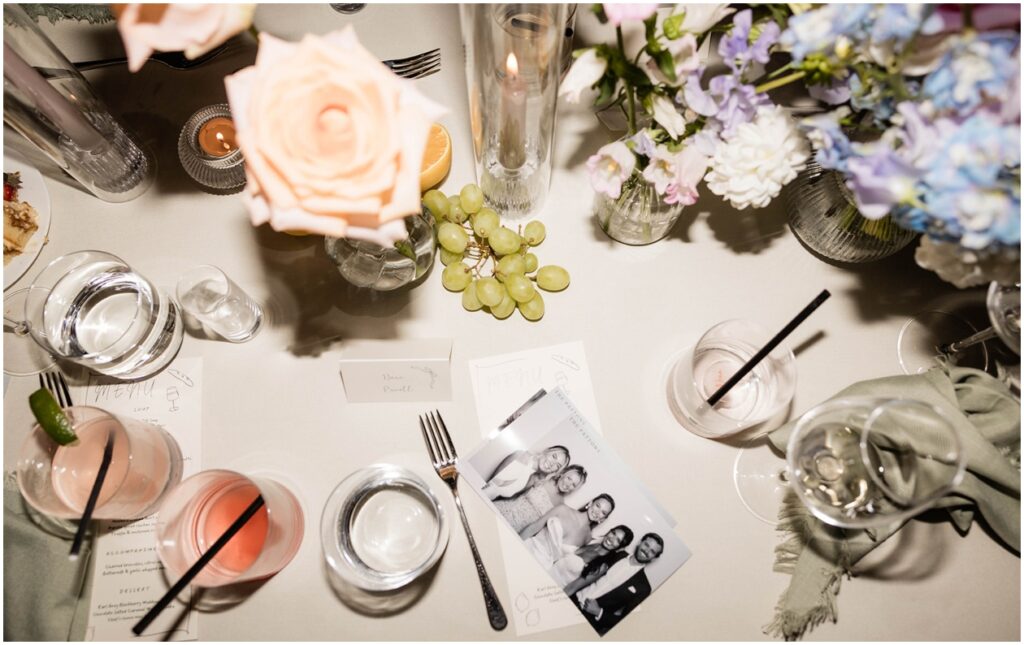 Colourful blooms took centre stage, bringing a sense of whimsy and movement to the space. The artful tablescapes came to life with a mix of bud vases, fruit, candlelight, and custom stationery. Some of the standout details included a lush floral cloud beneath the 3-tier blue wedding cake, and a custom-built seating display that welcomed guests into the reception.