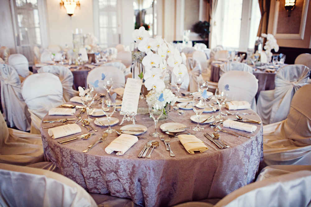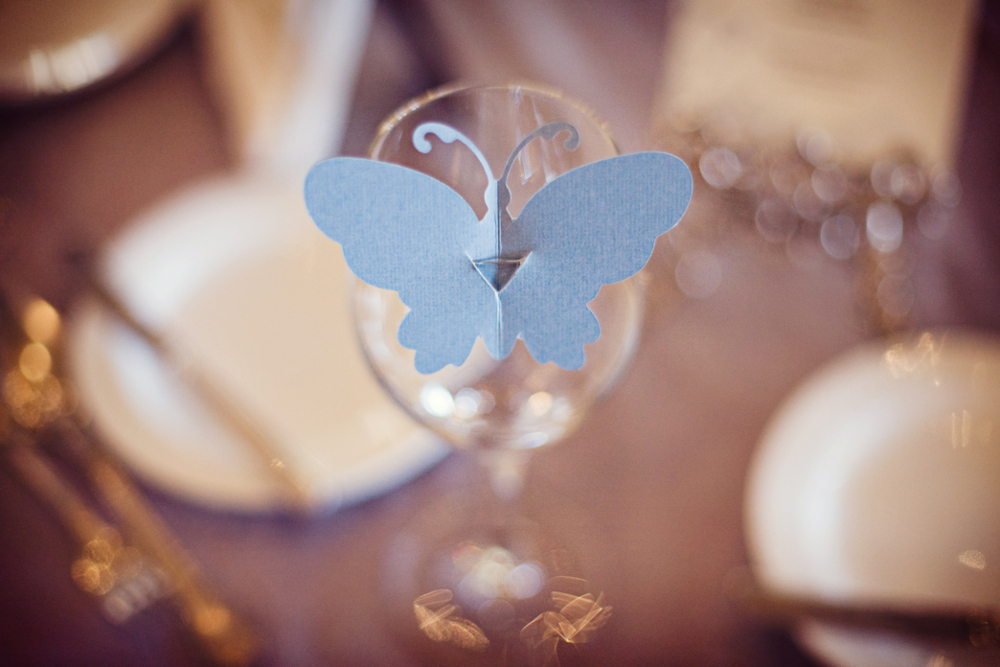 Victoria + Nathan opted to include thoughtful thank-you notes at each guest’s place setting. Blue butterfly place cards added a whimsical touch to the table décor.