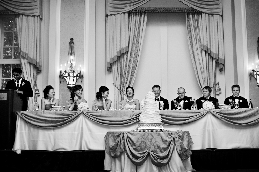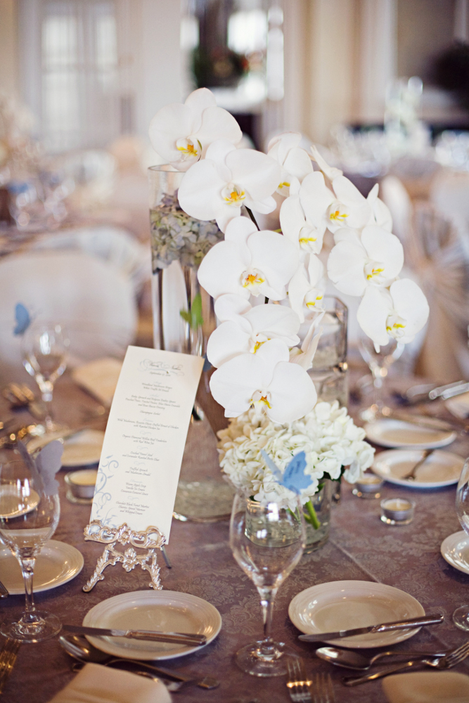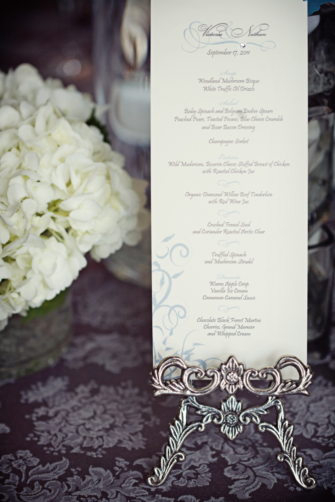At the reception guests left their thumbprint on a custom guest book tree drawing. The Empire Ballroom is naturally stunning, so minimal décor is required. The room was enhanced with vanilla satin chair wraps, silver damask linens and gorgeous centrepieces by La Piazza Dasee composed of white phalaenopsis orchids, and blue and white hydrangea.